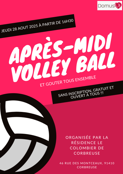 Demain à partir de 16h30, nous vous attendons nombreux pour partager un moment sportif et convivial autour d'une activité volley-ball réunissant résidents, familles et professionnels. Une belle occasion de bouger, rire et profiter ensemble d'un instant de complicité !