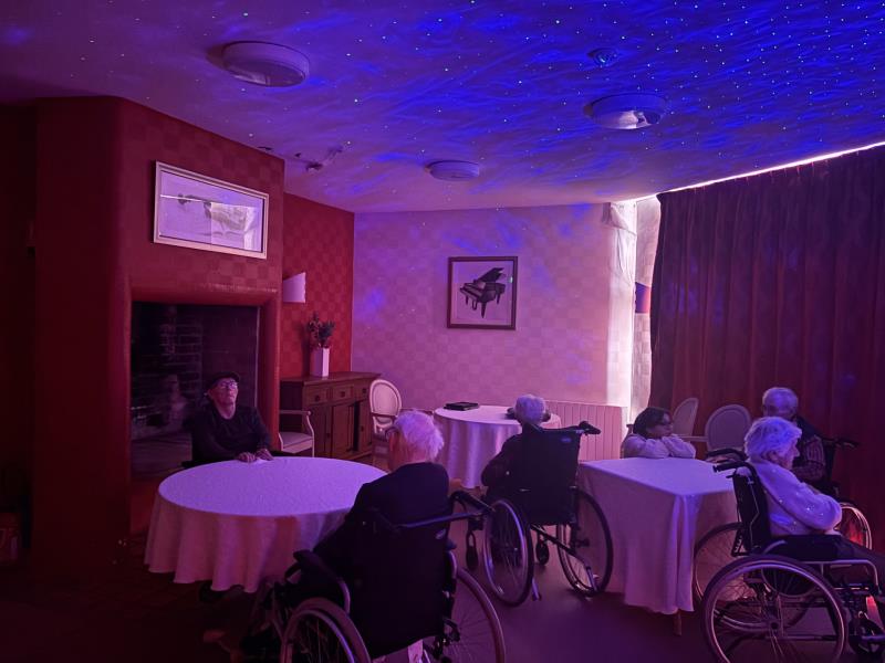 Cette salle sensorielle répond à un besoin de bien-être et de détente pour les résidents. Cet espace permet d'offrir un environnement apaisant, sécurisant et stimulant à la fois. A travers des ambiances lumineuses douces, des sons relaxants et dans peu de temps des stimulations sensorielles de différents types (odeur, toucher..). Elle permet également de recréer du lien avec les émotions et souvenirs en stimulant les sens de manière non intrusive.