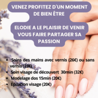 Publiée le 06/01/2025Chers tous, Elodie, esthéticienne diplômée et exerçant en institut et à domicile, vous propose un après-midi de beauté à la résidence ! Réservez pour votre proche (et / ou pour vous !) et bénéficiez d'un moment de plaisir et de bien-être ! Les tarifs son [...] Lire la suite