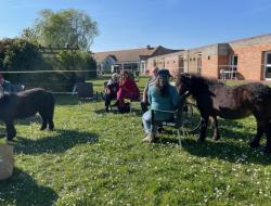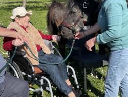 Le Colombier de Corbreuse > Actualités > Retour de l'équithérapie dans le jardin Retour de l'équithérapie dans le jardin Publiée le 11/04/2025 C'est avec un plaisir non dissimulé que les résidents ont retrouvé les poneys pour une séance tout en douceur, au jardin !